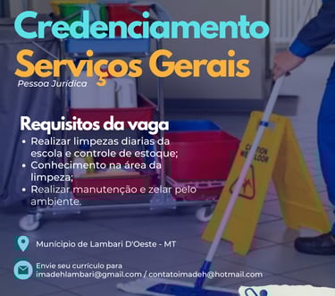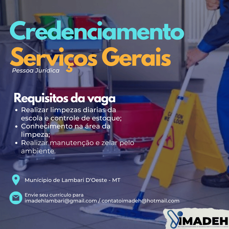 O Instituto Imadeh, abre credenciamento para prestação de serviço de Serviços Gerais no município de Lambari D'Oeste - MT.