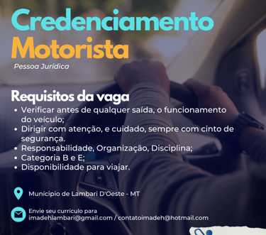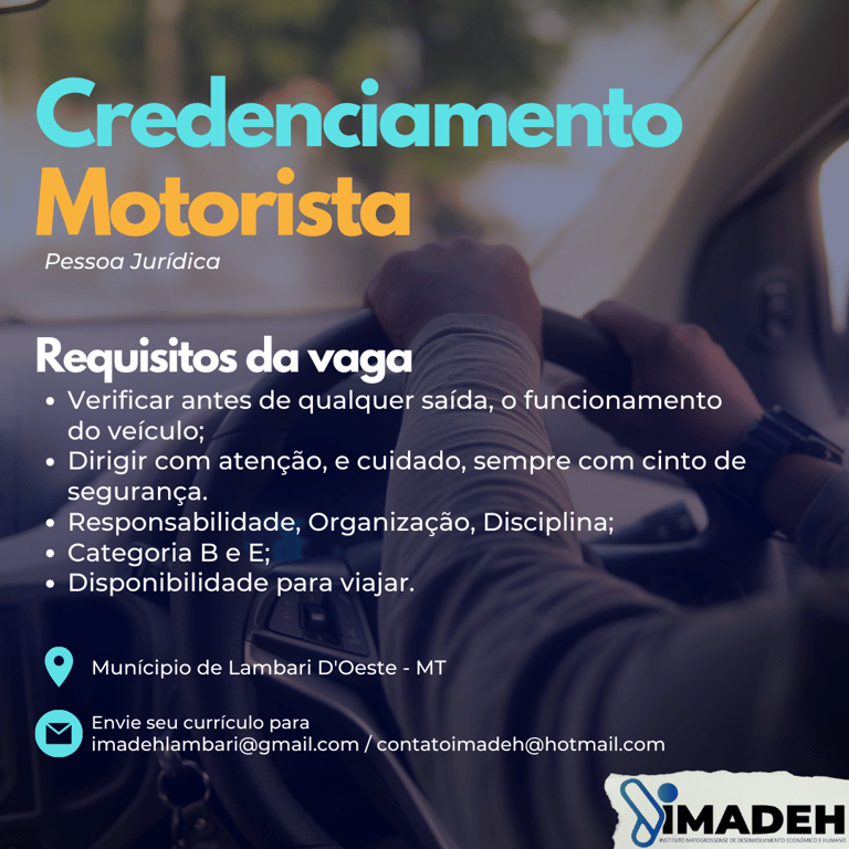 O Instituto Imadeh, abre credenciamento para prestação de serviço de Motorista no município de Lambari D'Oeste - MT.