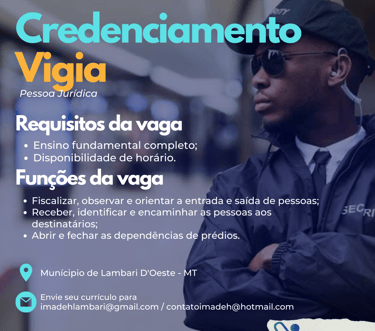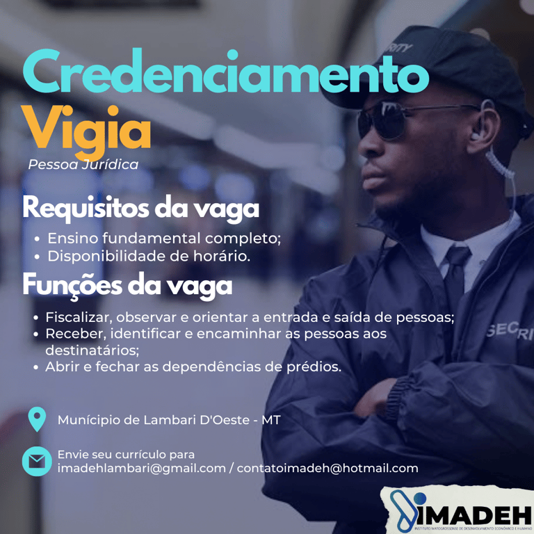 O Instituto Imadeh, abre credenciamento para prestação de serviço de Vigia no município de Lambari D'Oeste - MT.