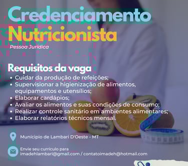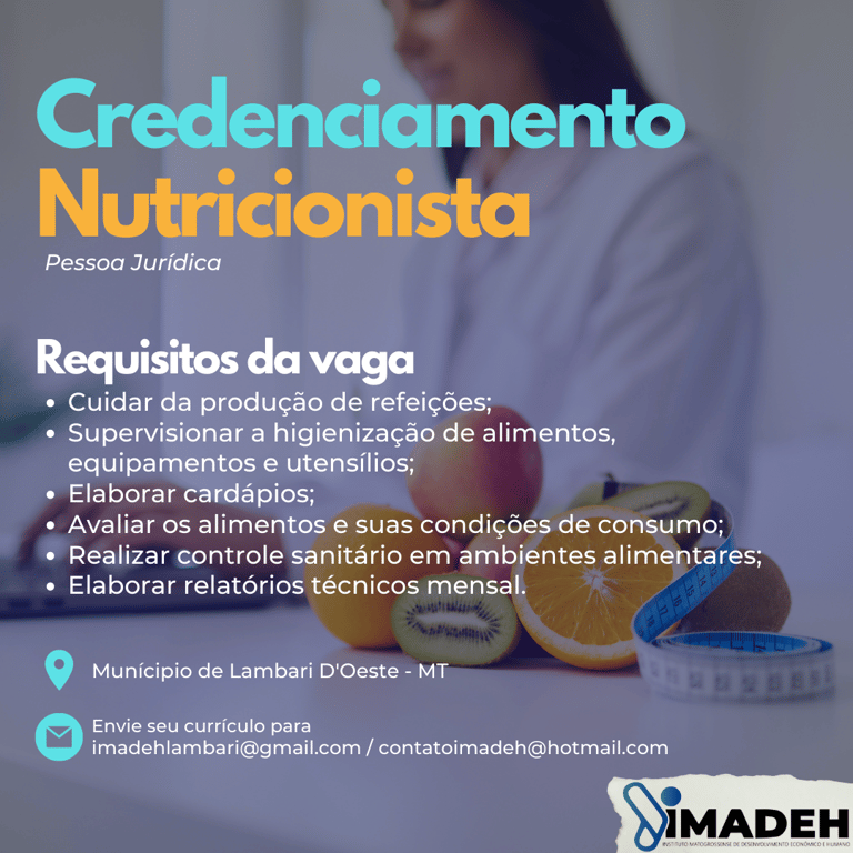 O Instituto Imadeh, abre credenciamento para prestação de serviço de Nutricionista no município de Lambari D'Oeste - MT.