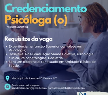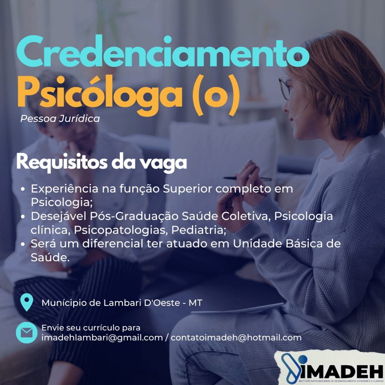 O Instituto Imadeh, abre credenciamento para prestação de serviço de Psicóloga (a) no município de Lambari D'Oeste - MT.