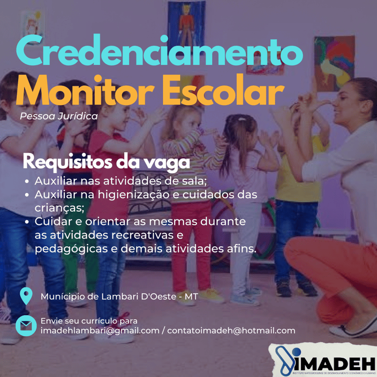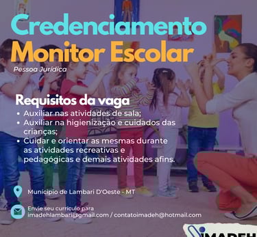 O Instituto Imadeh, abre credenciamento para prestação de serviço de Monitor Escolar no município de Lambari D'Oeste - MT.