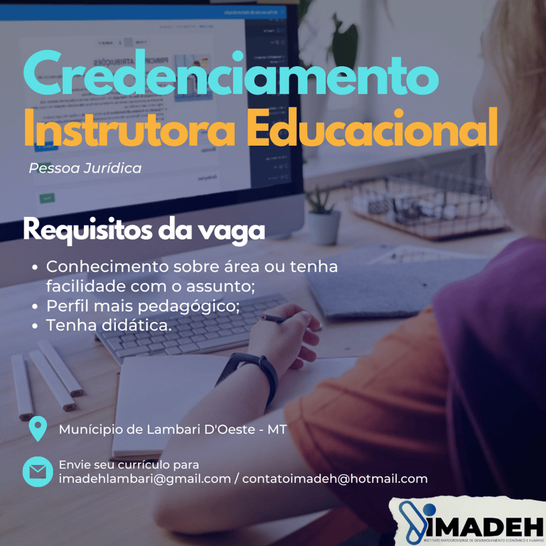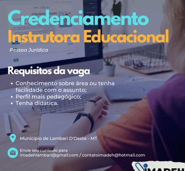 O Instituto Imadeh, abre credenciamento para prestação de serviço de Instrutora Educacional no município de Lambari D'Oeste - MT.
