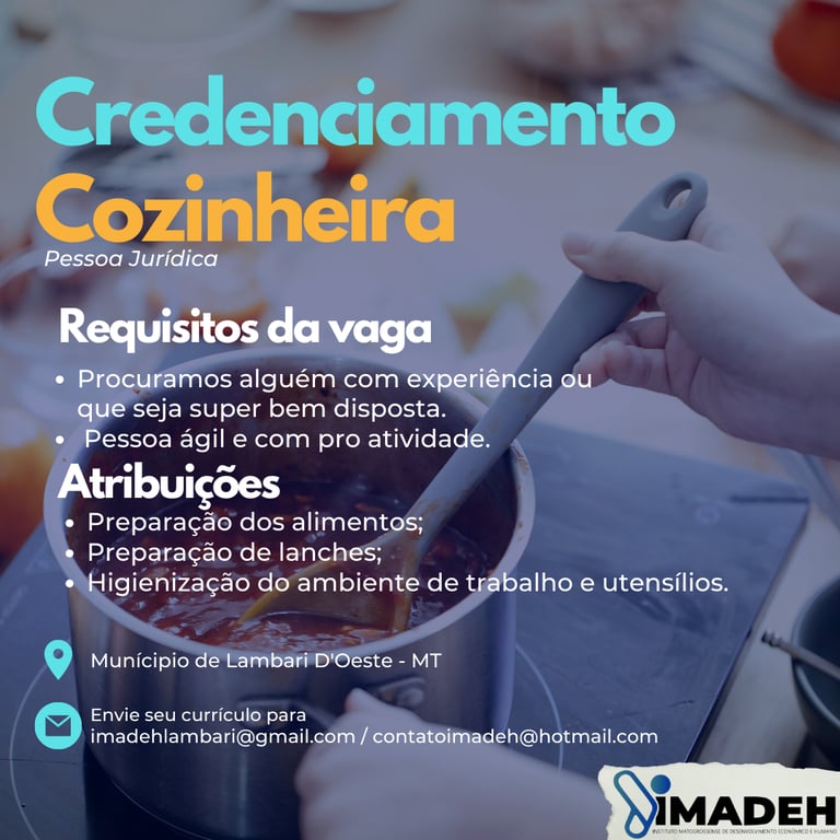 O Instituto Imadeh, abre credenciamento para prestação de serviço de Cozinheira no município de Lambari D'Oeste - MT.